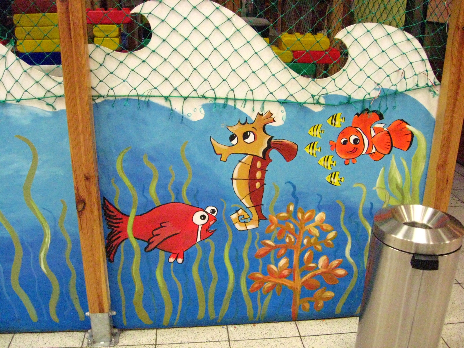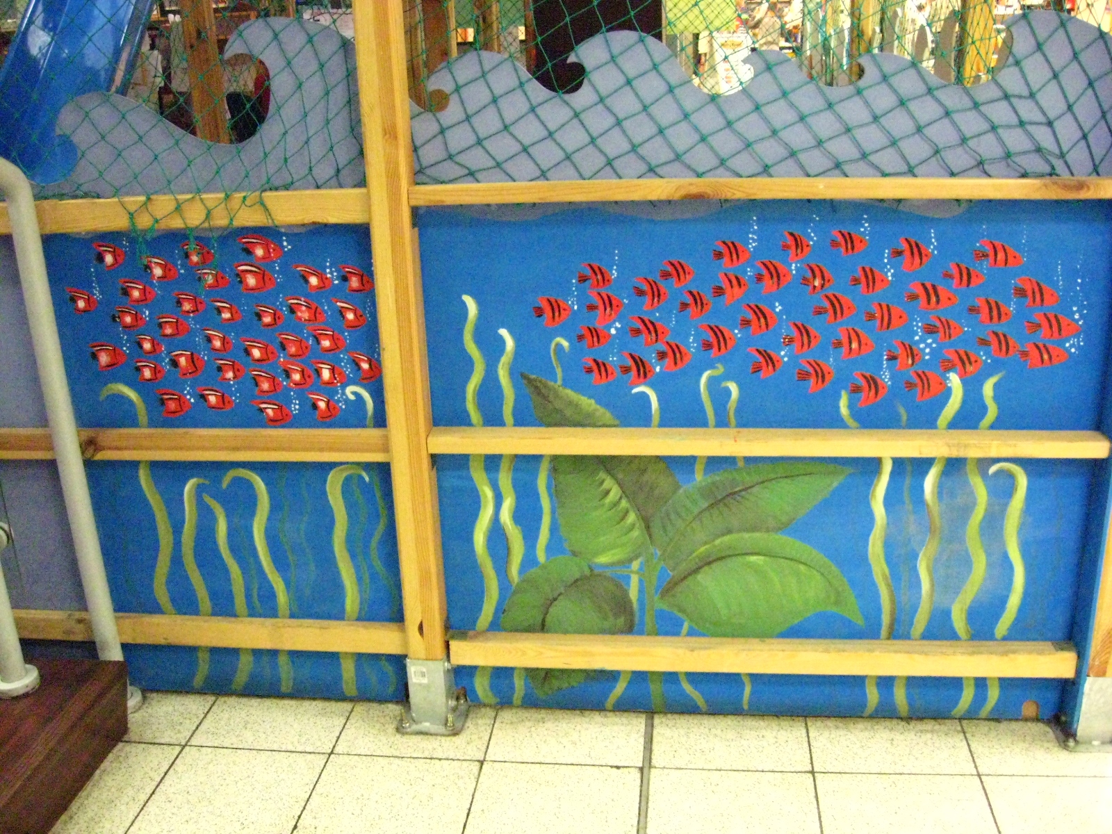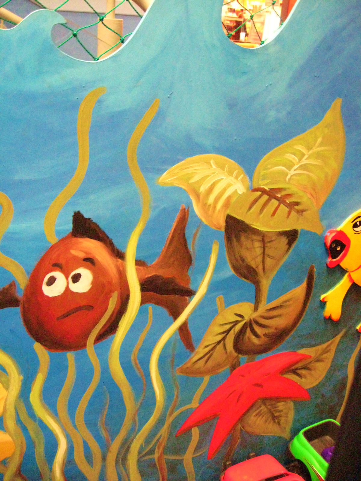 Aktiv oferuje zadaszone place zabaw dla dzieci. Jakiś czas temu mieli w swojej ofercie aż 5 dużych placów, w których w każdym w większej bądź mniejszej mierze nasza artystka Marta Borsodi malowała dzieła dla najmłodszych. Każdy plac ma swój własny motyw przewodni, np. Zamek, Dziki Zachód, czy Świat Podwodny. Dodatkowo poza przestrzenią wspólną ma odrębne pomieszczania, czyli Pokoiki Urodzinowe. W tej części portfolio zobaczysz plac „Świat Podwodny”.