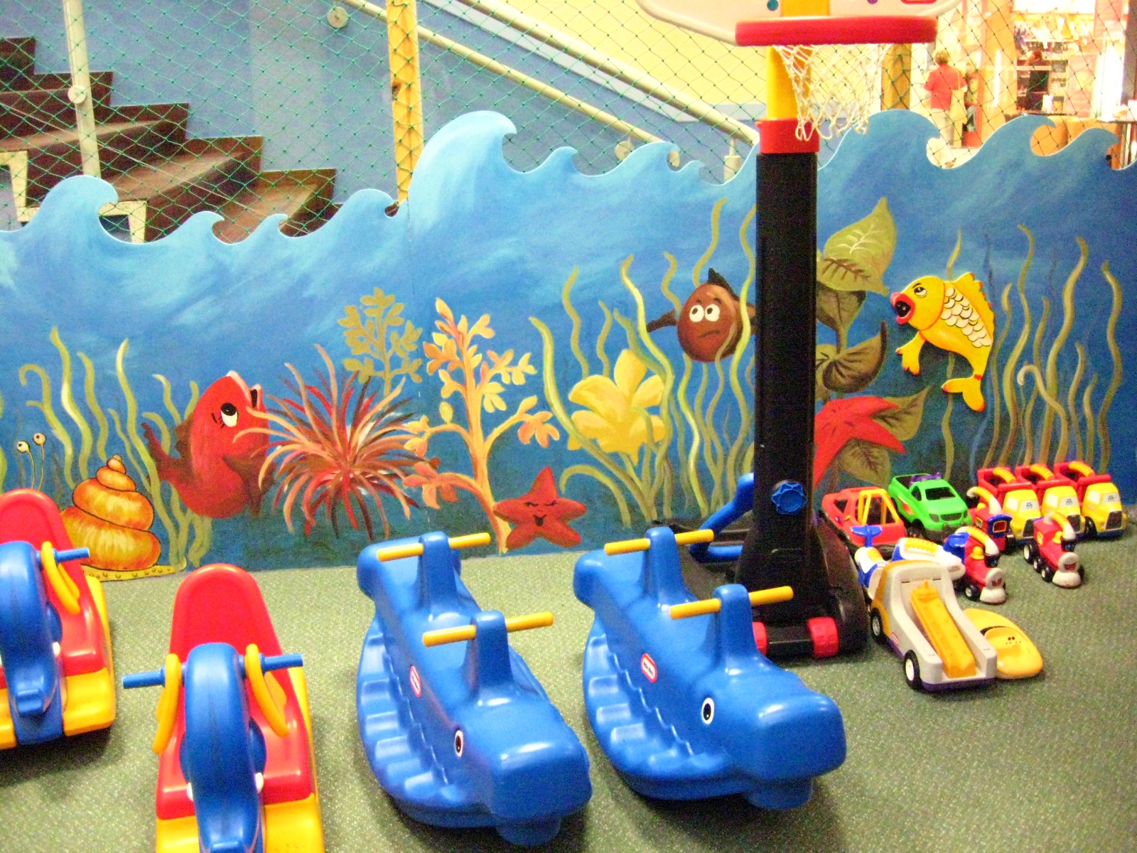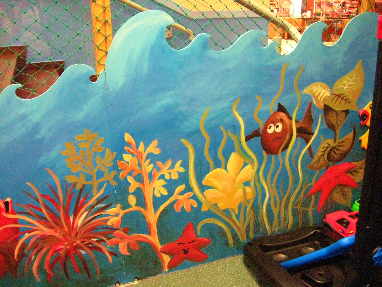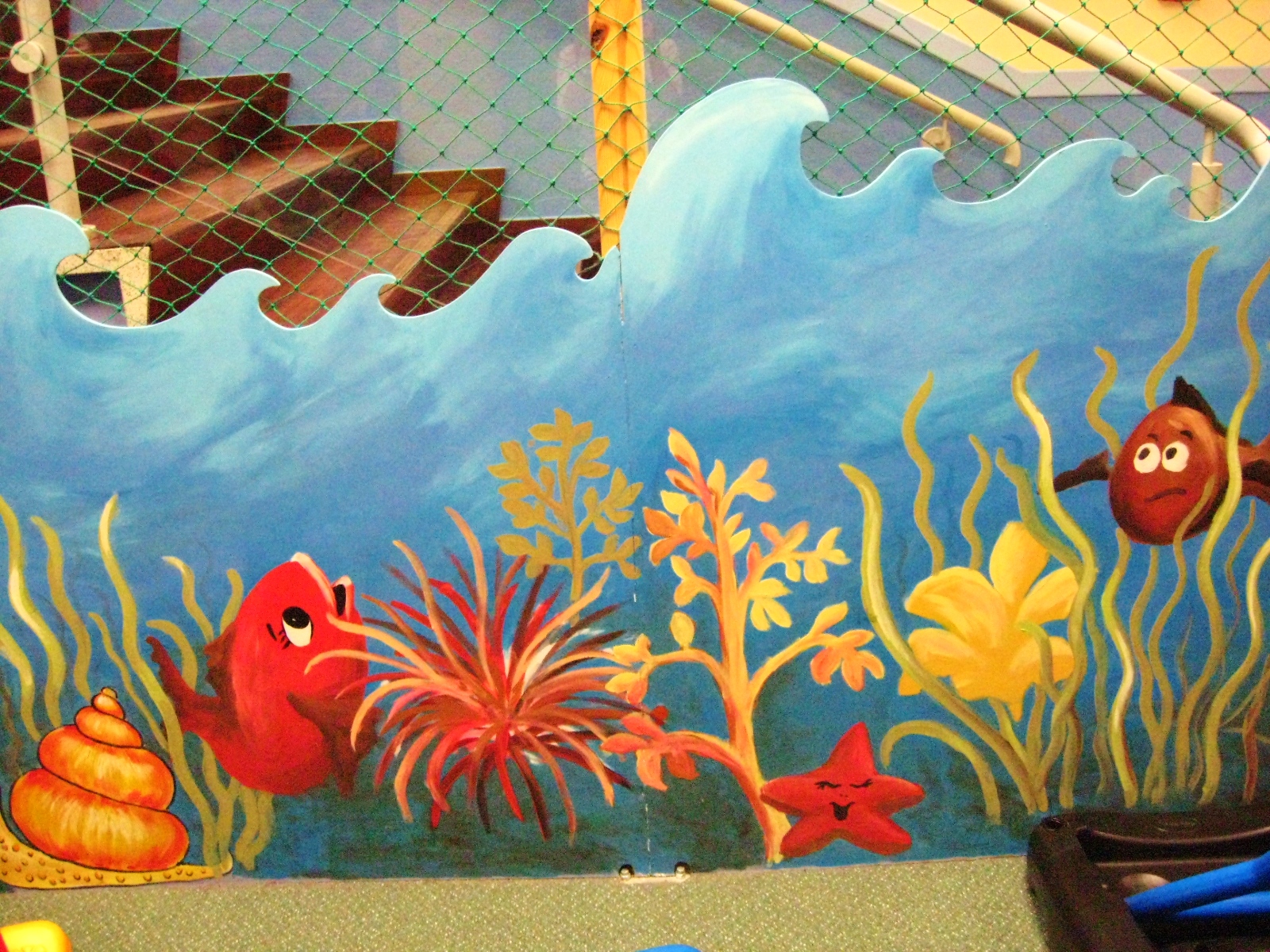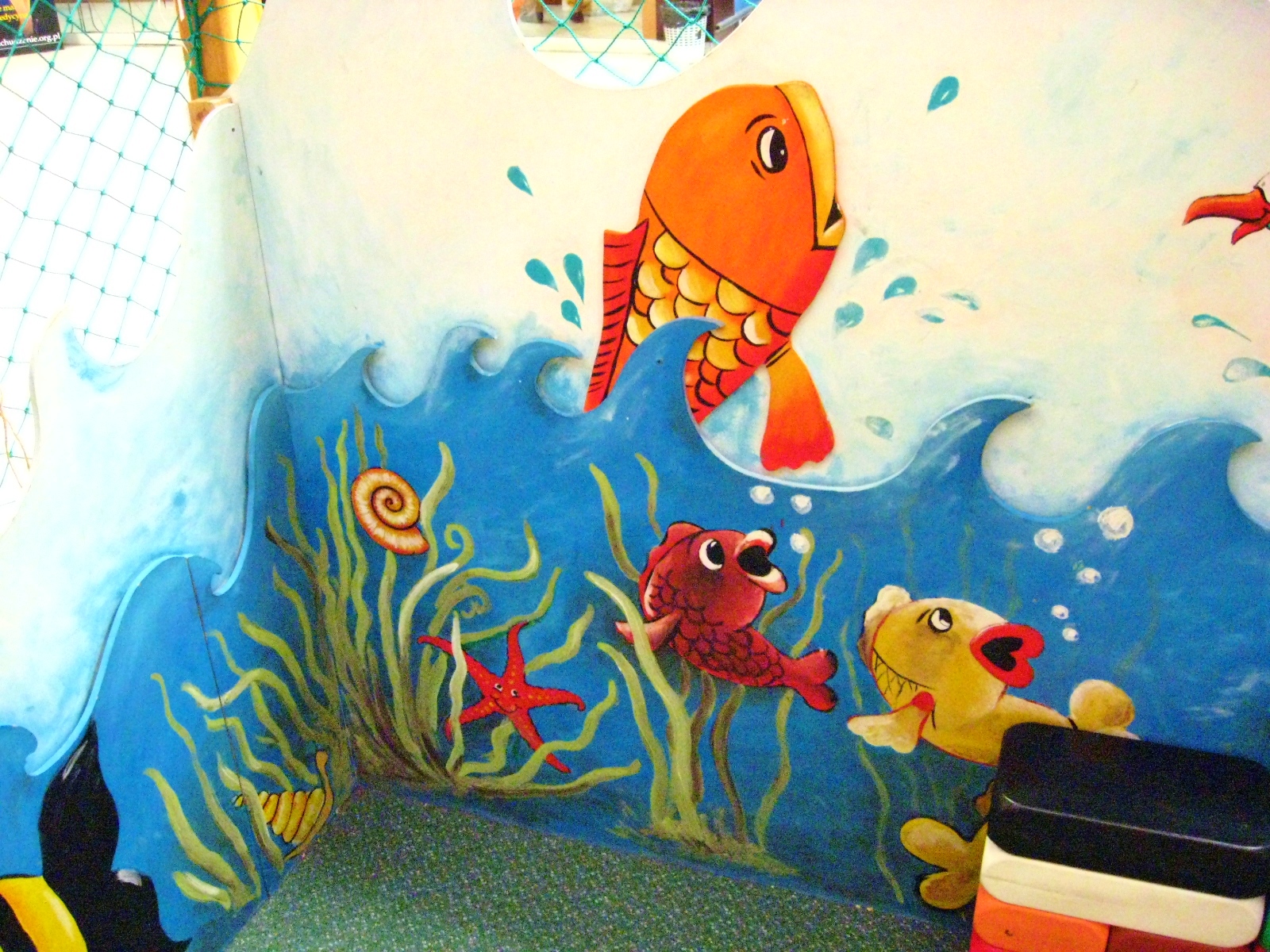 Aktiv oferuje zadaszone place zabaw dla dzieci. Jakiś czas temu mieli w swojej ofercie aż 5 dużych placów, w których w każdym w większej bądź mniejszej mierze nasza artystka Marta Borsodi malowała dzieła dla najmłodszych. Każdy plac ma swój własny motyw przewodni, np. Zamek, Dziki Zachód, czy Świat Podwodny. Dodatkowo poza przestrzenią wspólną ma odrębne pomieszczania, czyli Pokoiki Urodzinowe. W tej części portfolio zobaczysz plac „Świat Podwodny”.