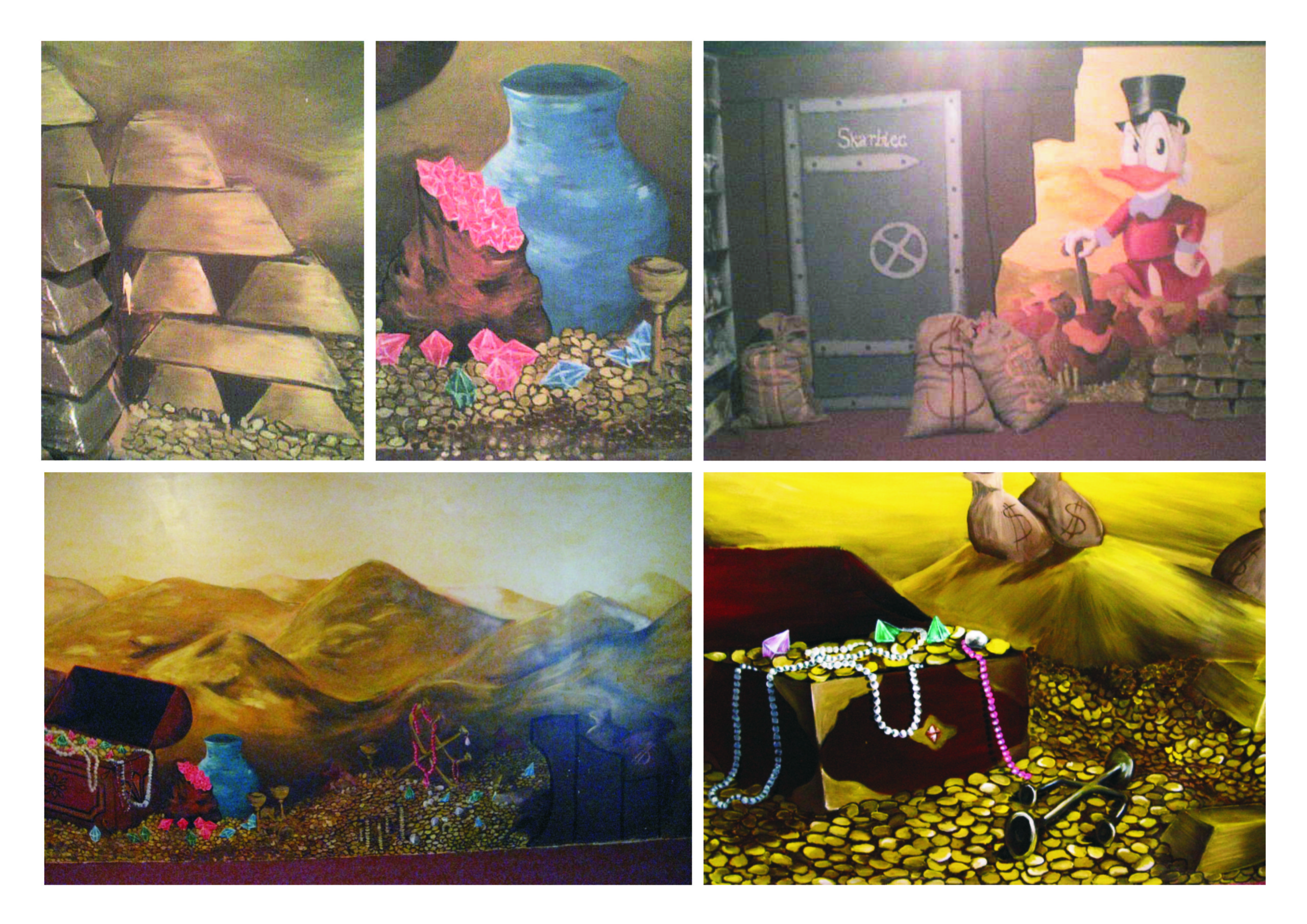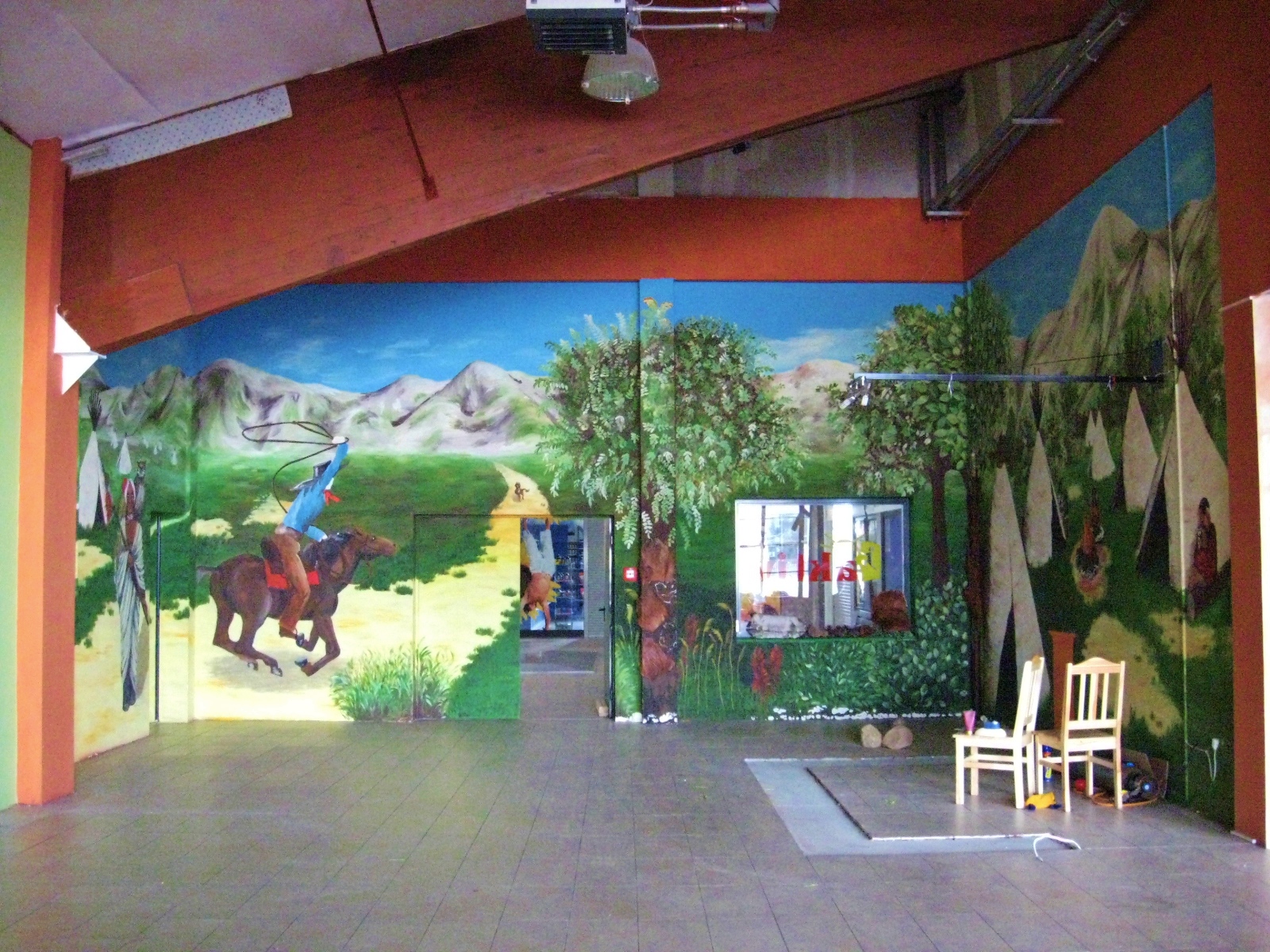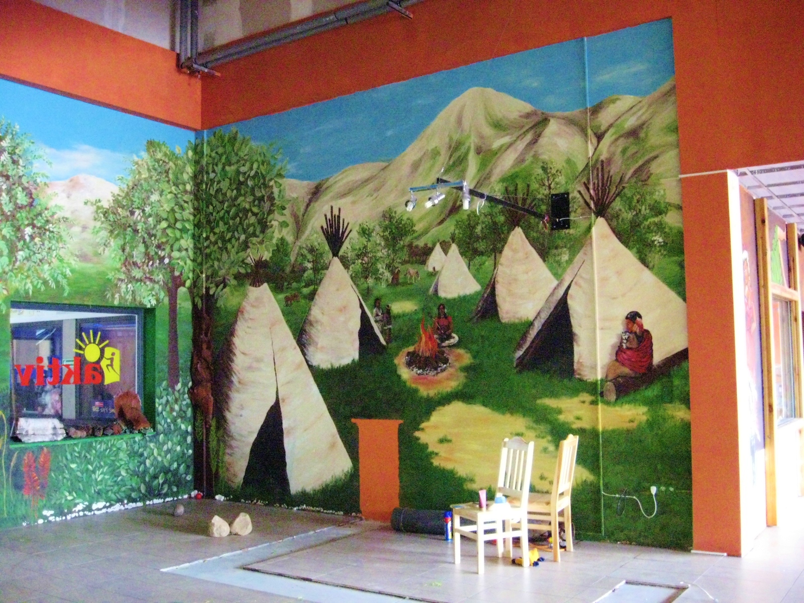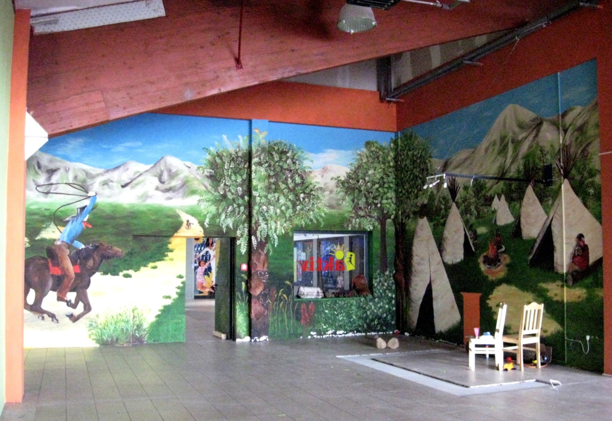 Aktiv oferuje zadaszone place zabaw dla dzieci. Jakiś czas temu mieli w swojej ofercie aż 5 dużych placów, w których w każdym w większej bądź mniejszej mierze nasza artystka Marta Borsodi malowała dzieła dla najmłodszych. Każdy plac ma swój własny motyw przewodni, np. Zamek, Dziki Zachód, czy Świat Podwodny. Dodatkowo poza przestrzenią wspólną ma odrębne pomieszczania, czyli Pokoiki Urodzinowe. W tej części portfolio zobaczysz plac „Dziki Zachód”. W recepcji tego placu Marta malowała wraz J. Przybylską grafikę przedstawiająca wioskę indiańską na powierzchni 100m2. Jak widzisz, znajdują się tam tipi, indiańskie domki, na tle pięknych krajobrazów. W innej części placu Marta z artystką J. Przybylską namalowały salkę urodzinową „Bank”, gdzie głównym motywem jest Donald Duck i jego złote królestwo.