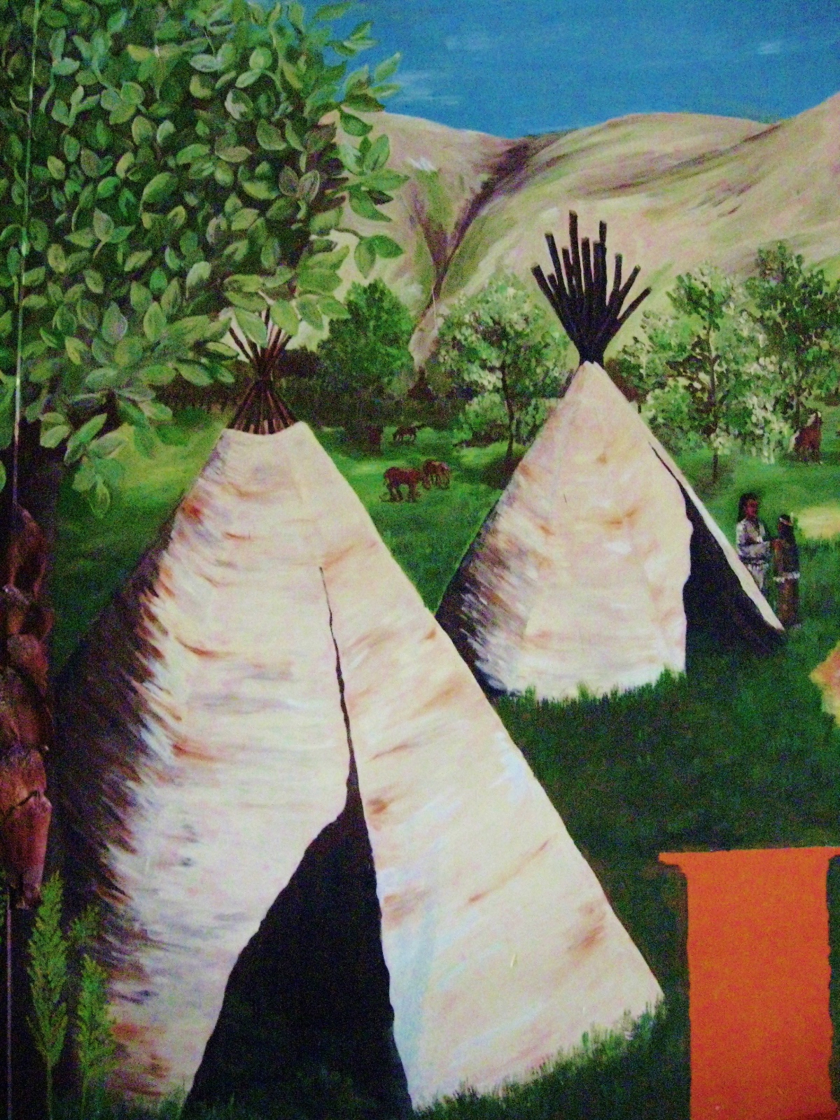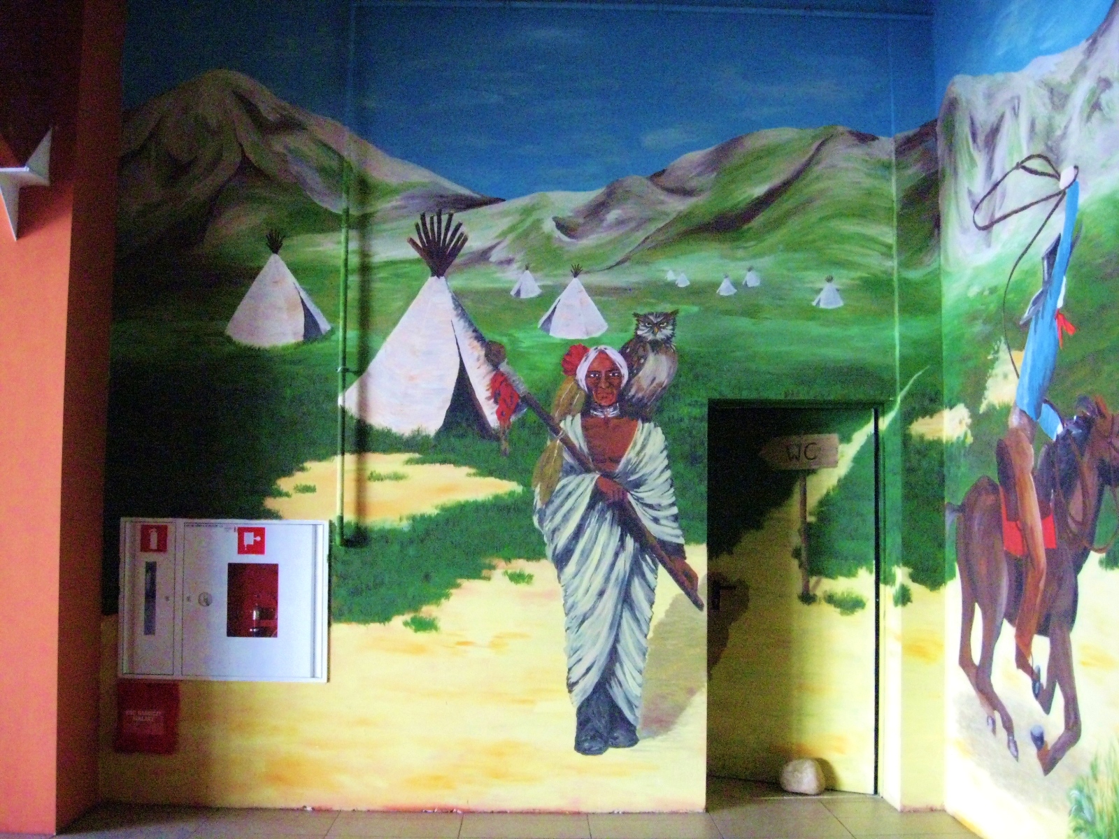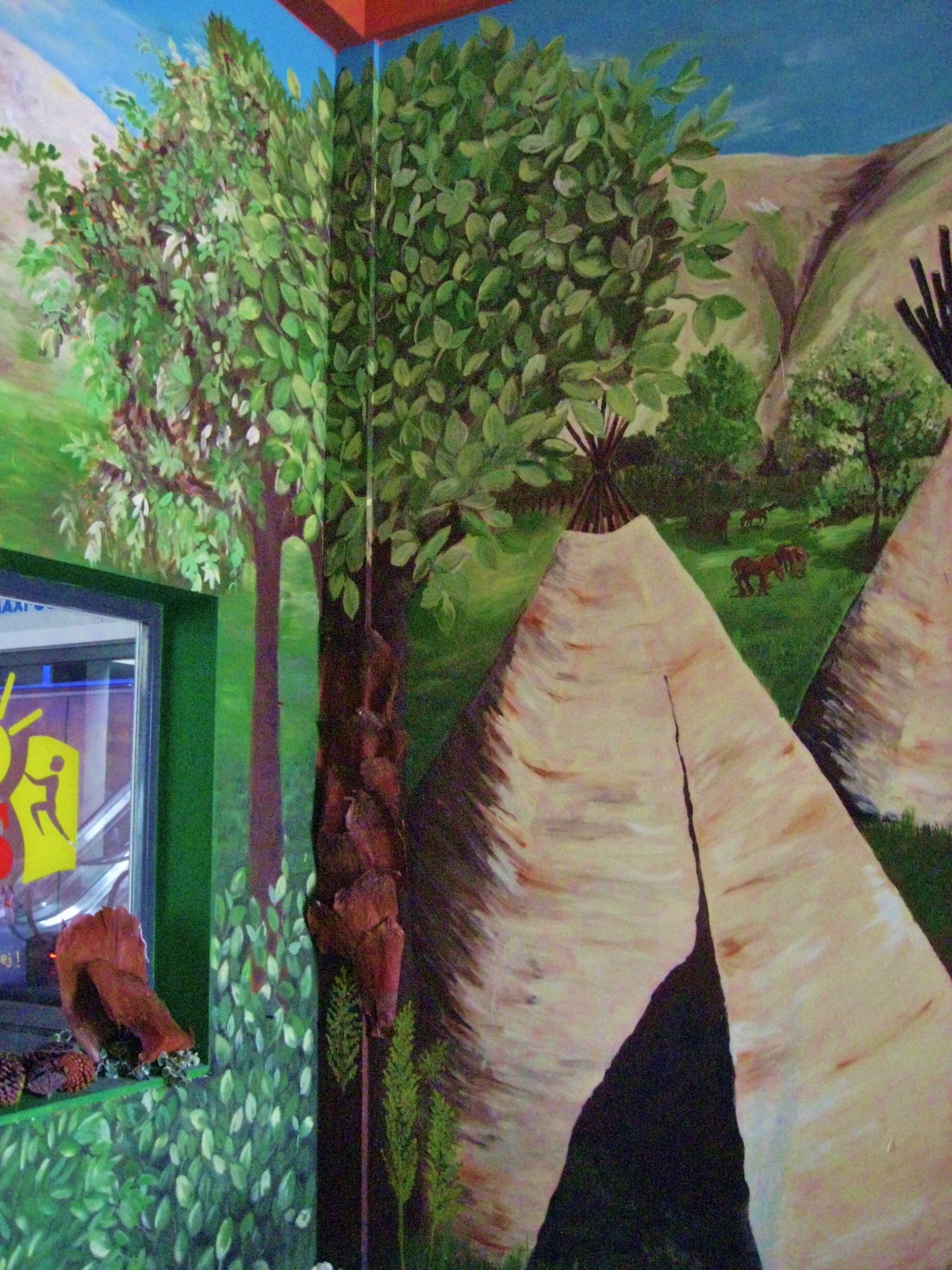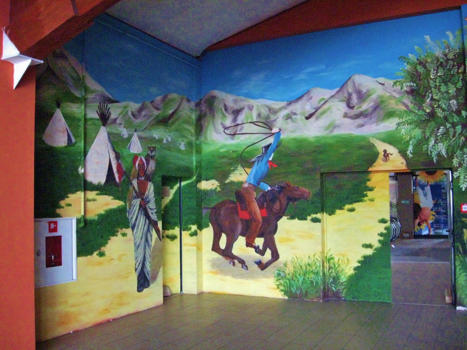 Aktiv oferuje zadaszone place zabaw dla dzieci. Jakiś czas temu mieli w swojej ofercie aż 5 dużych placów, w których w każdym w większej bądź mniejszej mierze nasza artystka Marta Borsodi malowała dzieła dla najmłodszych. Każdy plac ma swój własny motyw przewodni, np. Zamek, Dziki Zachód, czy Świat Podwodny. Dodatkowo poza przestrzenią wspólną ma odrębne pomieszczania, czyli Pokoiki Urodzinowe. W tej części portfolio zobaczysz plac „Dziki Zachód”. W recepcji tego placu Marta malowała wraz J. Przybylską grafikę przedstawiająca wioskę indiańską na powierzchni 100m2. Jak widzisz, znajdują się tam tipi, indiańskie domki, na tle pięknych krajobrazów. W innej części placu Marta z artystką J. Przybylską namalowały salkę urodzinową „Bank”, gdzie głównym motywem jest Donald Duck i jego złote królestwo.