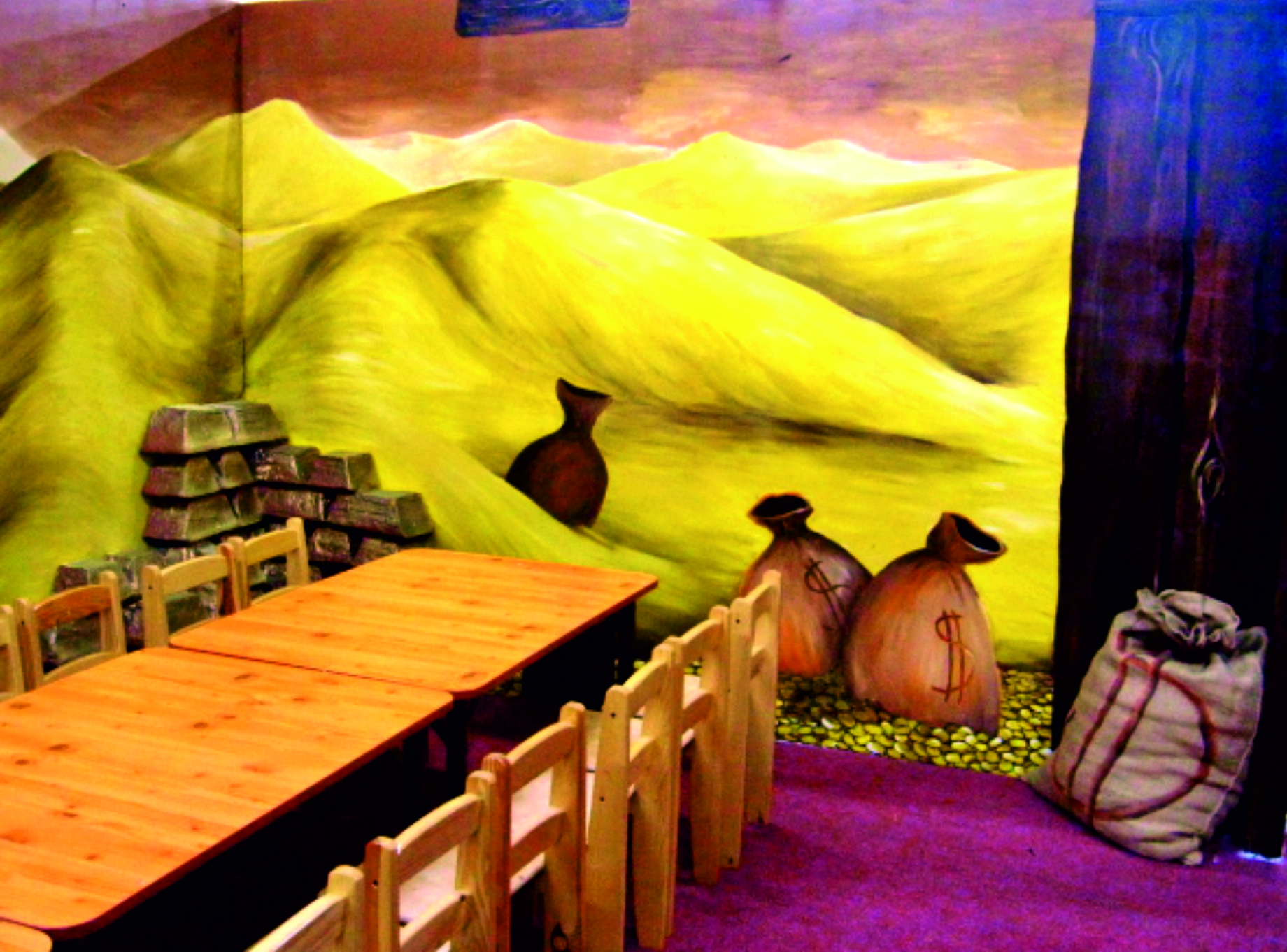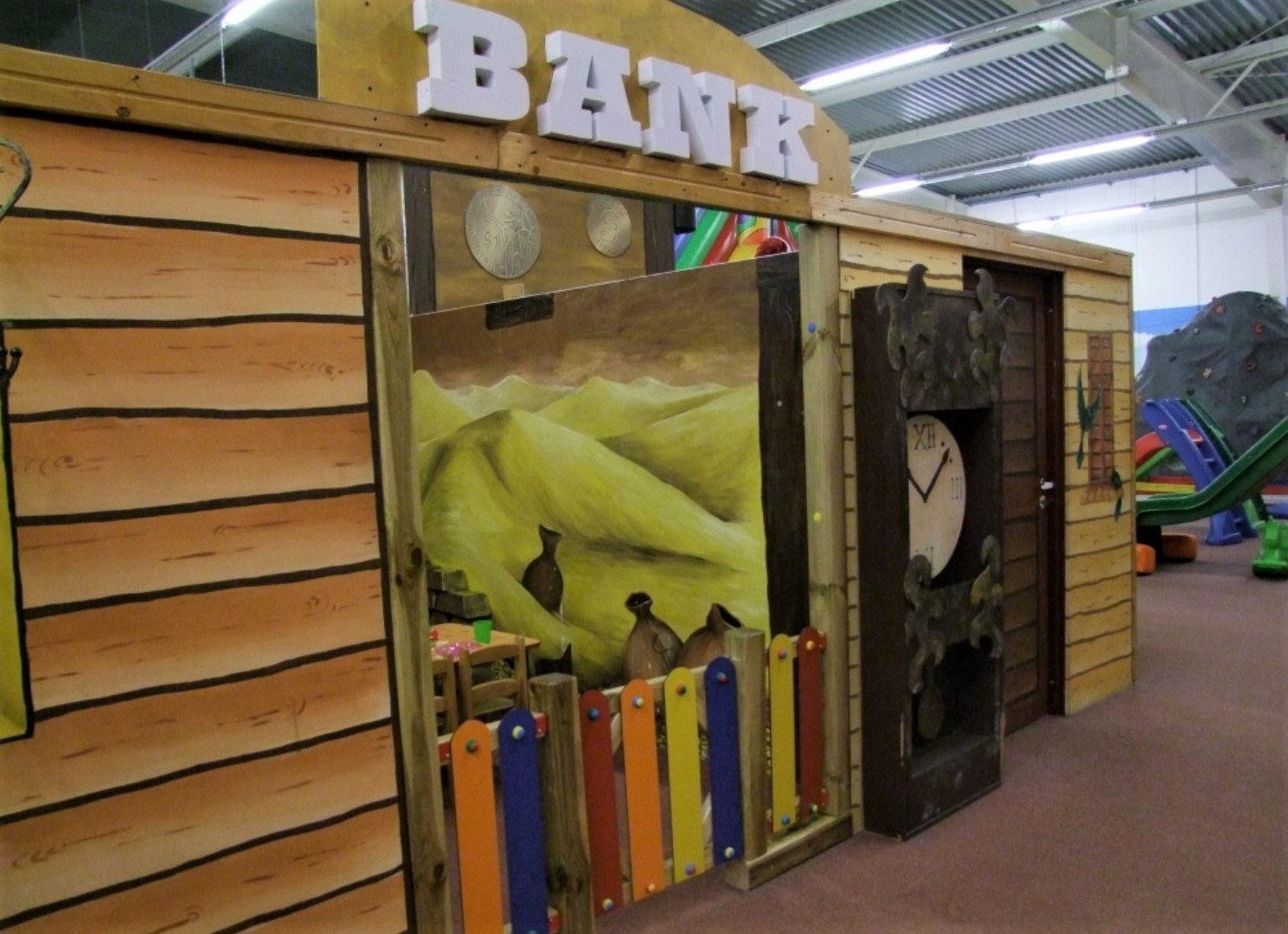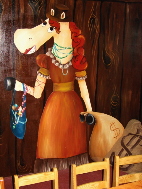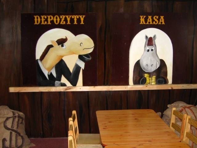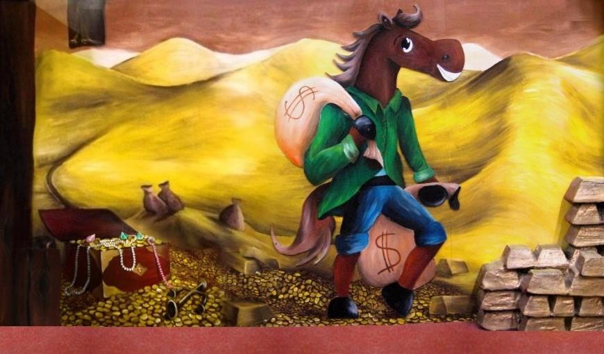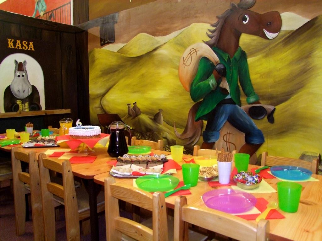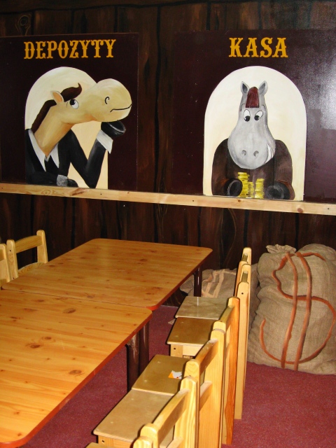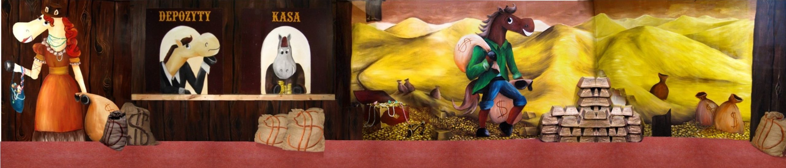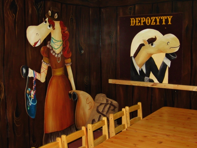 Aktiv oferuje zadaszone place zabaw dla dzieci. Jakiś czas temu mieli w swojej ofercie aż 5 dużych placów, w których w każdym w większej bądź mniejszej mierze nasza artystka Marta Borsodi malowała dzieła dla najmłodszych. Każdy plac ma swój własny motyw przewodni, np. Zamek, Dziki Zachód, czy Świat Podwodny. Dodatkowo poza przestrzenią wspólną ma odrębne pomieszczania, czyli Pokoiki Urodzinowe. W tej części portfolio zobaczysz plac „Dziki Zachów II” z pokoikiem urodzinowym „Bank”. Tutaj Marta Borsodi wyobraziła sobie, że to konie są pracownikami banku, a także ich klientami. Spójrz jaki to ciekawy, zaczarowany świat!