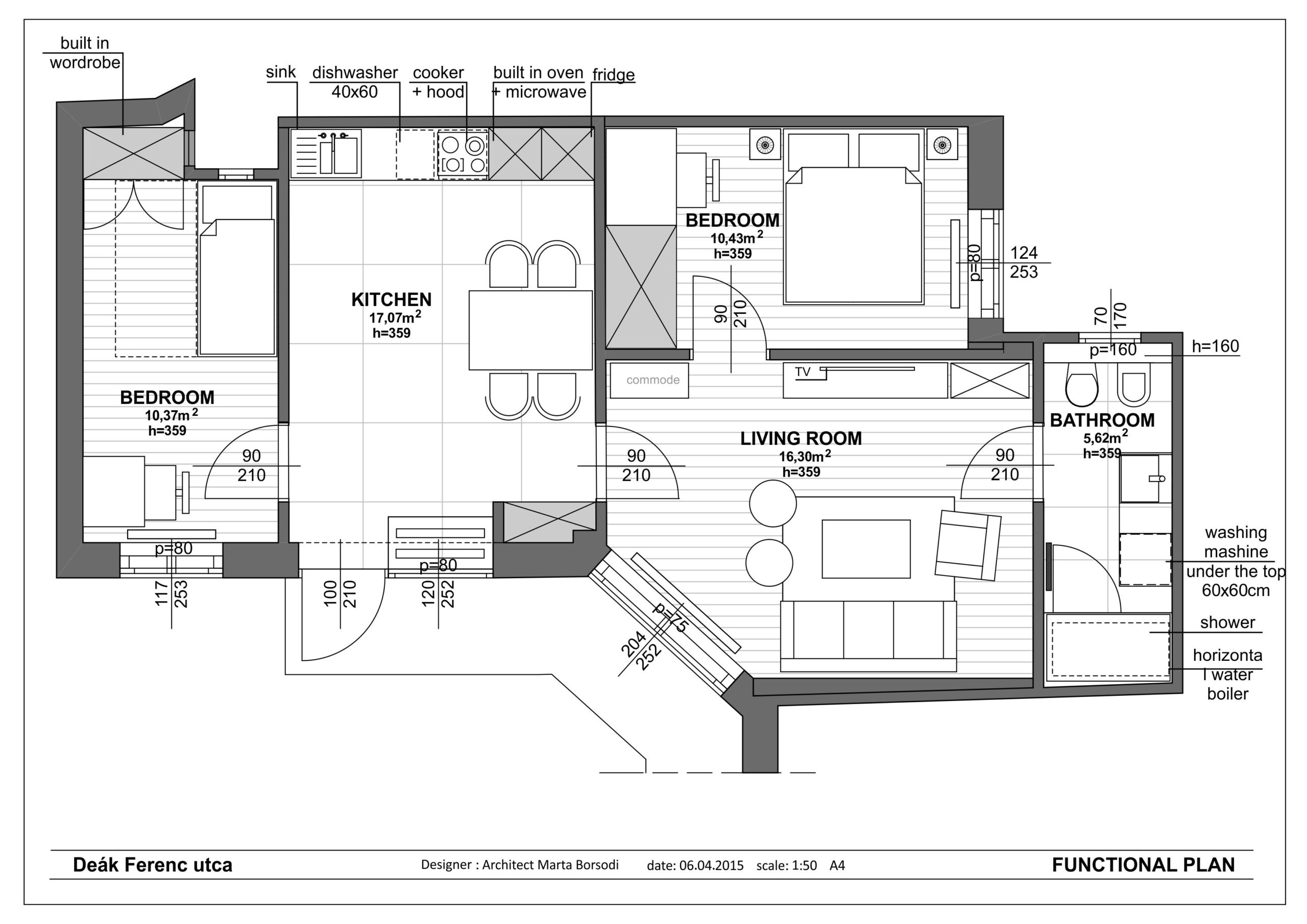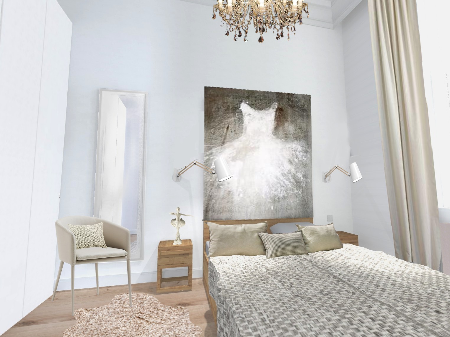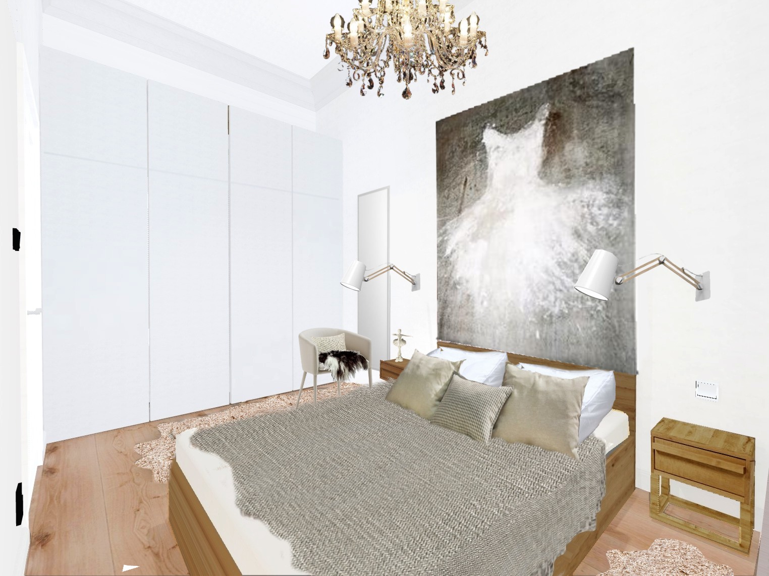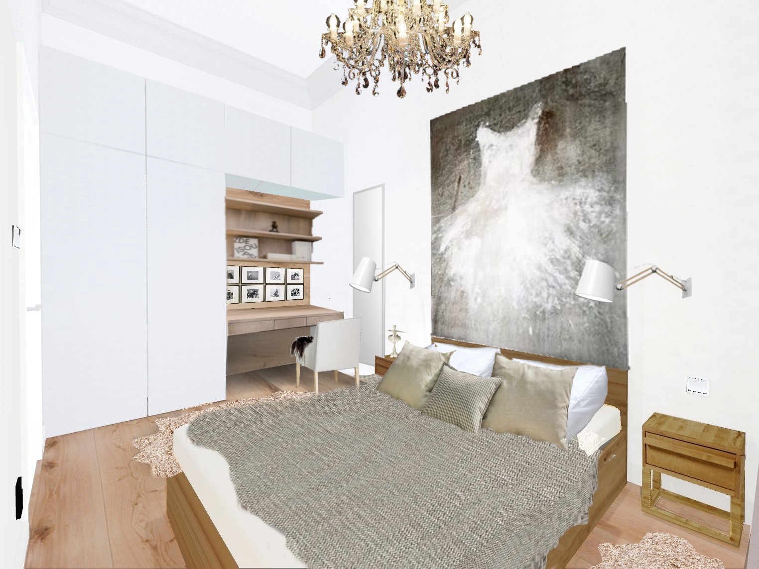 Jest to projekt wnętrz mieszkania na ulicy Deák Ferenc w samym sercu Budapesztu, gdzie zaplanowaliśmy nowy układ pomieszczeń, w wyniku czego otrzymaliśmy kuchnię, salon, 2 sypialnie i łazienkę. W tej części portfolio zobaczysz zdjęcia sypialni. Zaprojektowaliśmy wbudowaną szafę, w której ukryte jest biurko. Możesz przy nim zrobić makijaż, poczytać książkę, wypełnić dokumenty. Jeśli nie pracujesz już przy biurku, zamknij drzwi szafy, by je schować i otrzymać bardziej harmonijny wygląd pokoju.