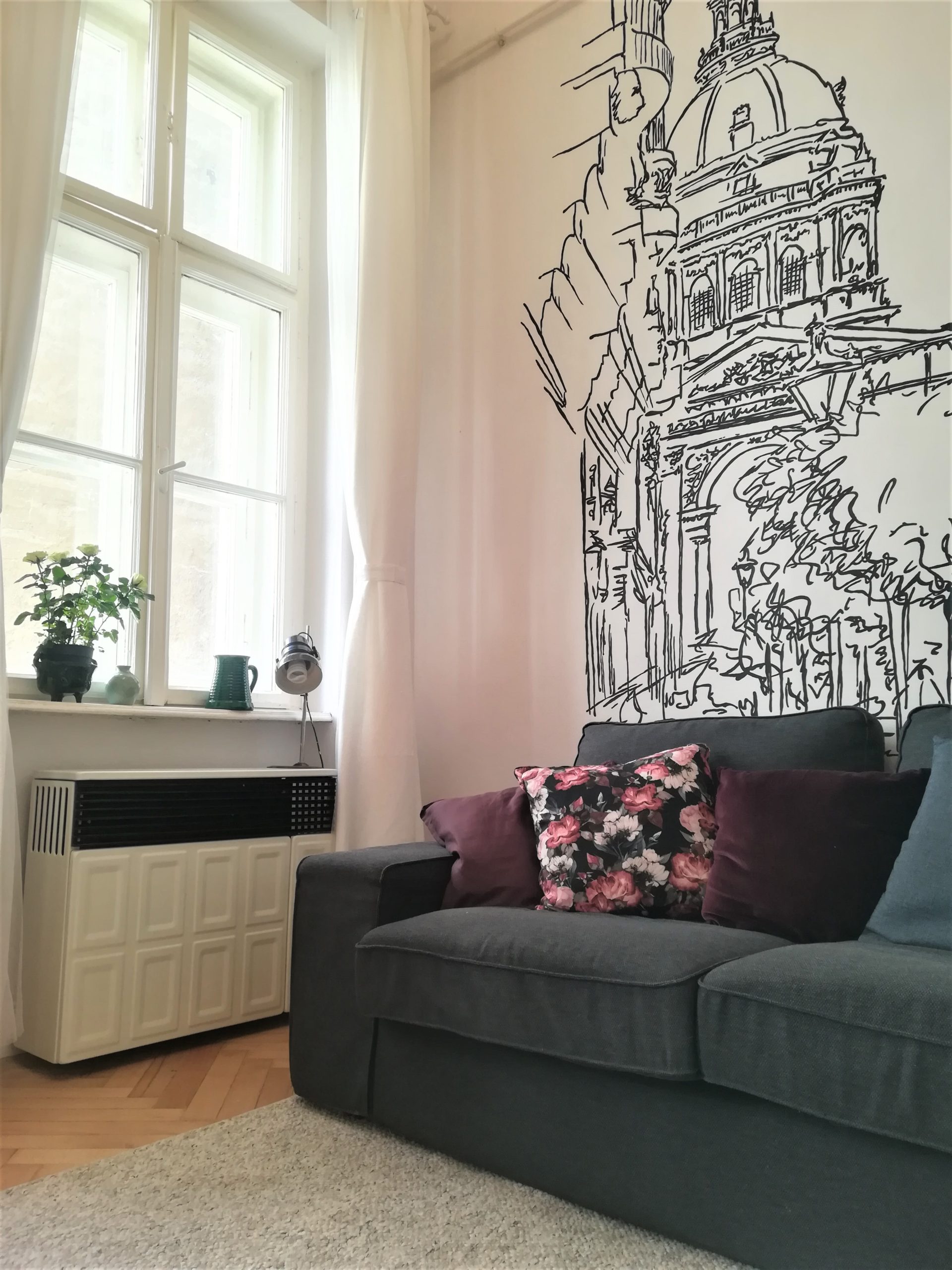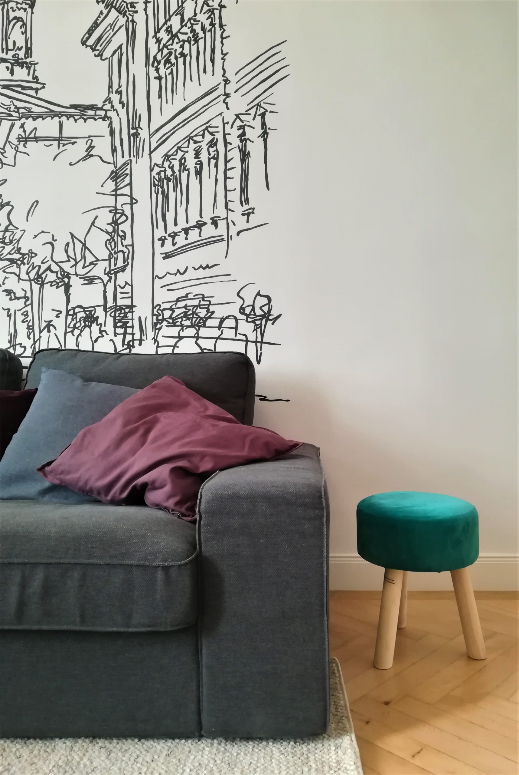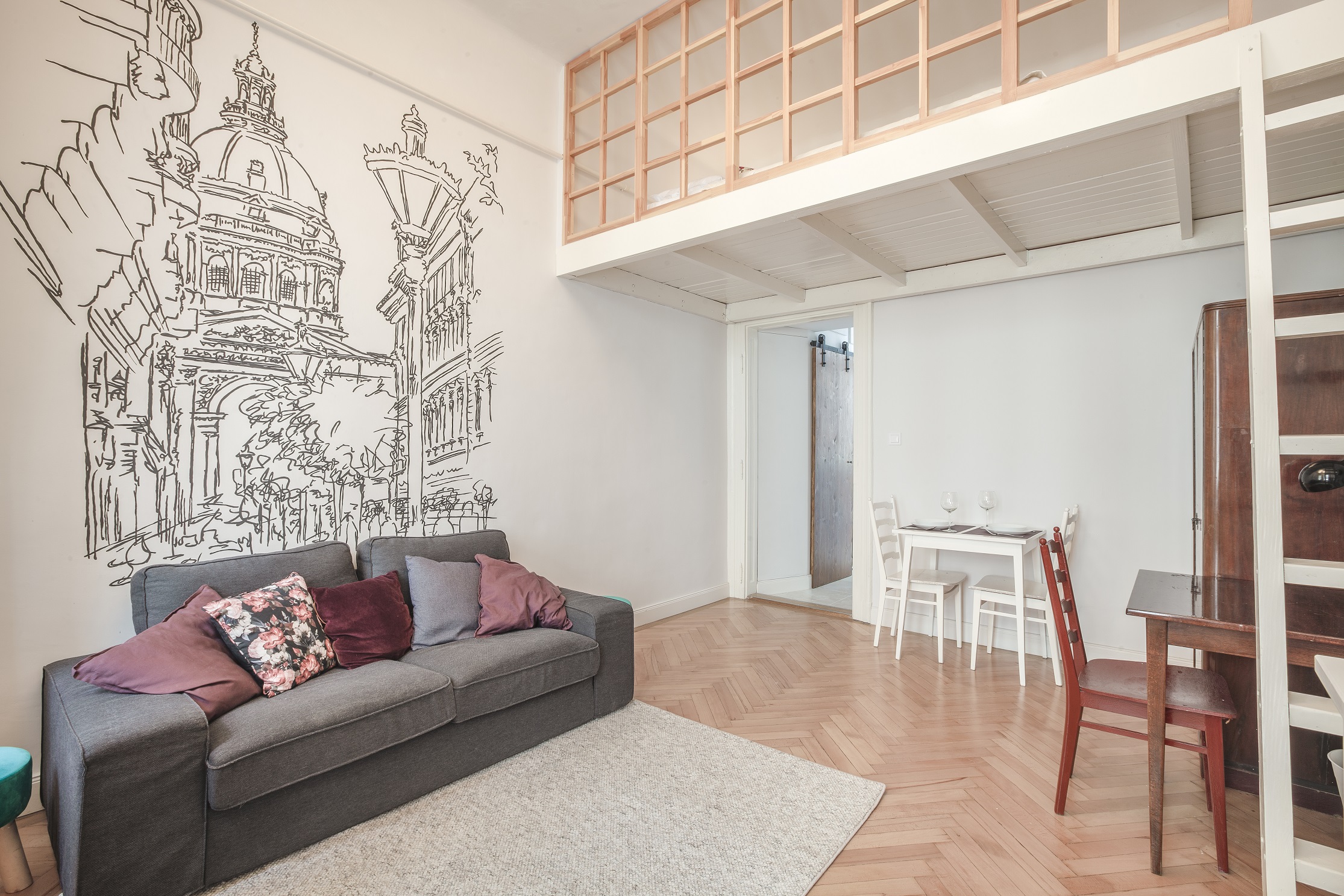In this 33 m2 floor space we designed spacious, functional and beautiful apartment. This flat will be rented out for tourists and foreigners who come to Budapest for short period of time and we want them to feel special in this unforgettable place, what they would get to love and never forget. We connected modernity with traditional Hungarian style, that is why we used red, green and white colors. What is more, we painted St Stephen Basilica’s graphics on the wall in the living room. This is one of the most popular and beautiful touristic attractions in Budapest. It was our “100% of interior design” type of project. We have prepared all necessary plans and design, moreover we did most of renovation works by our own hands as well!
