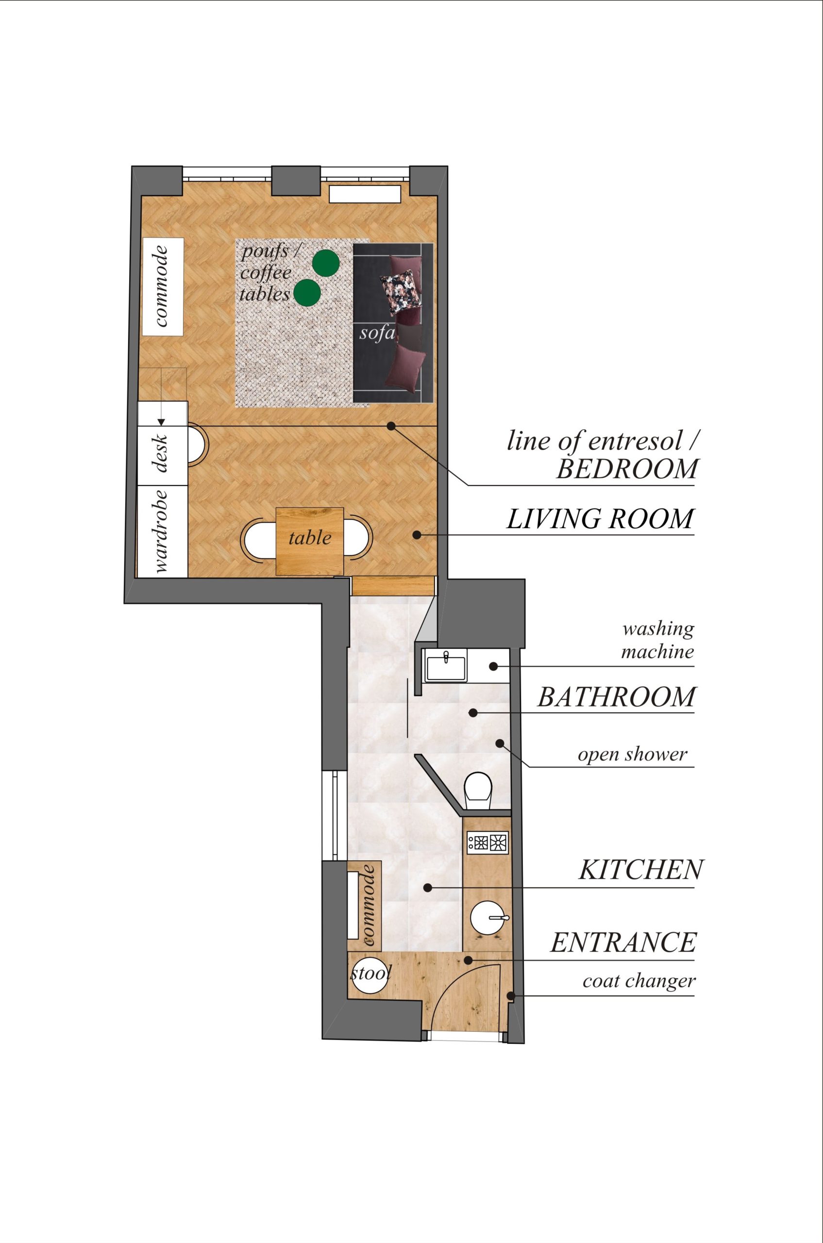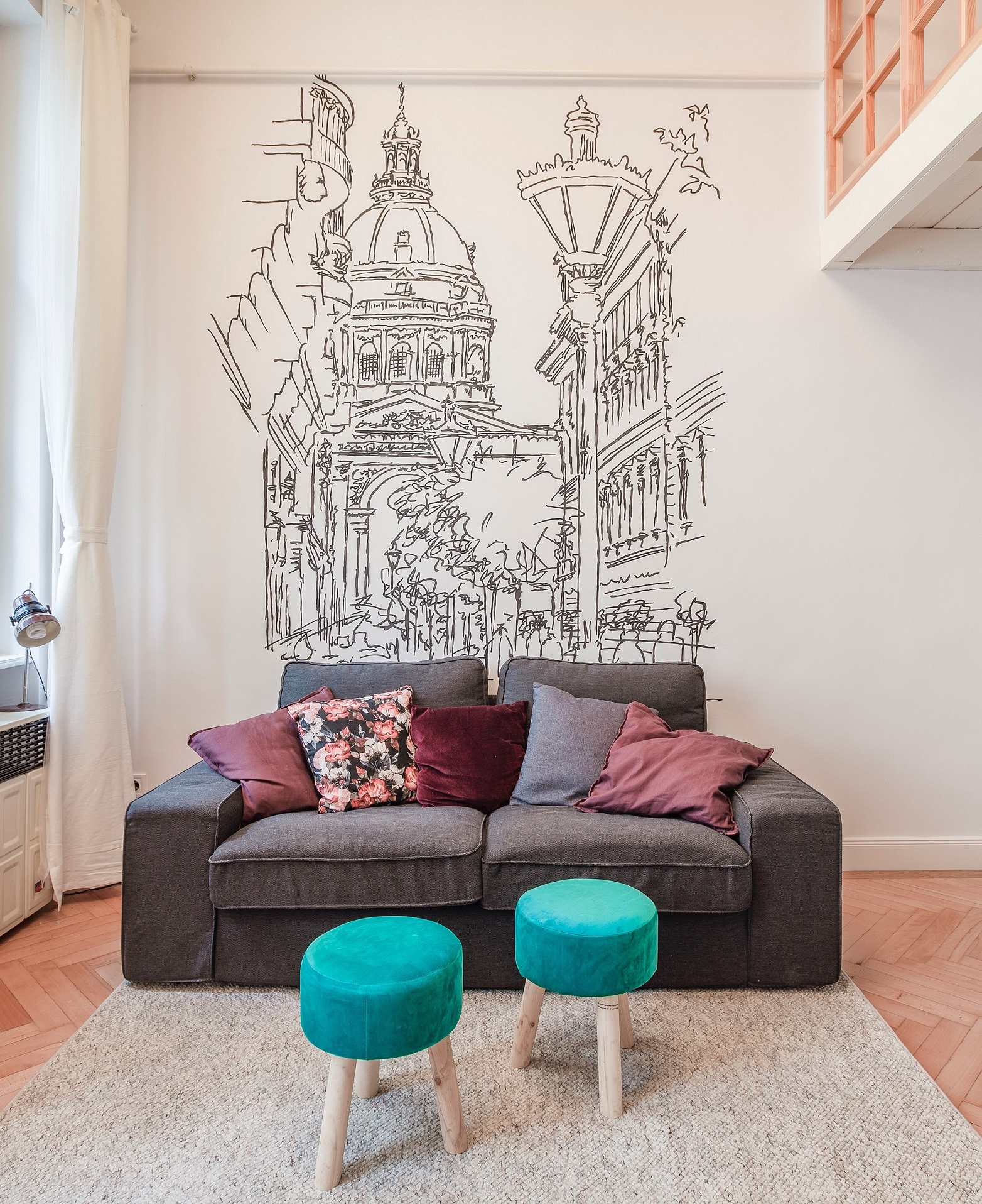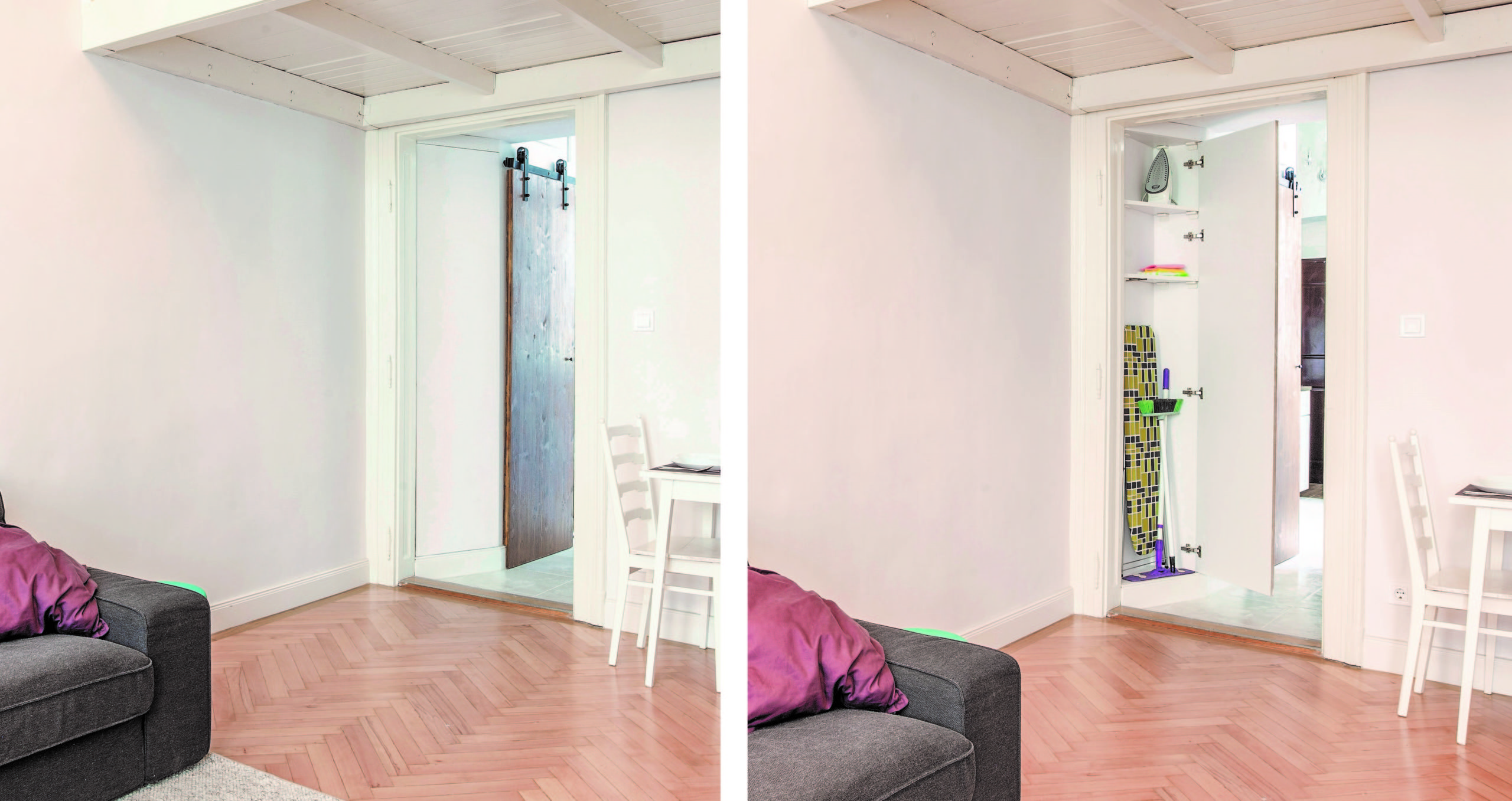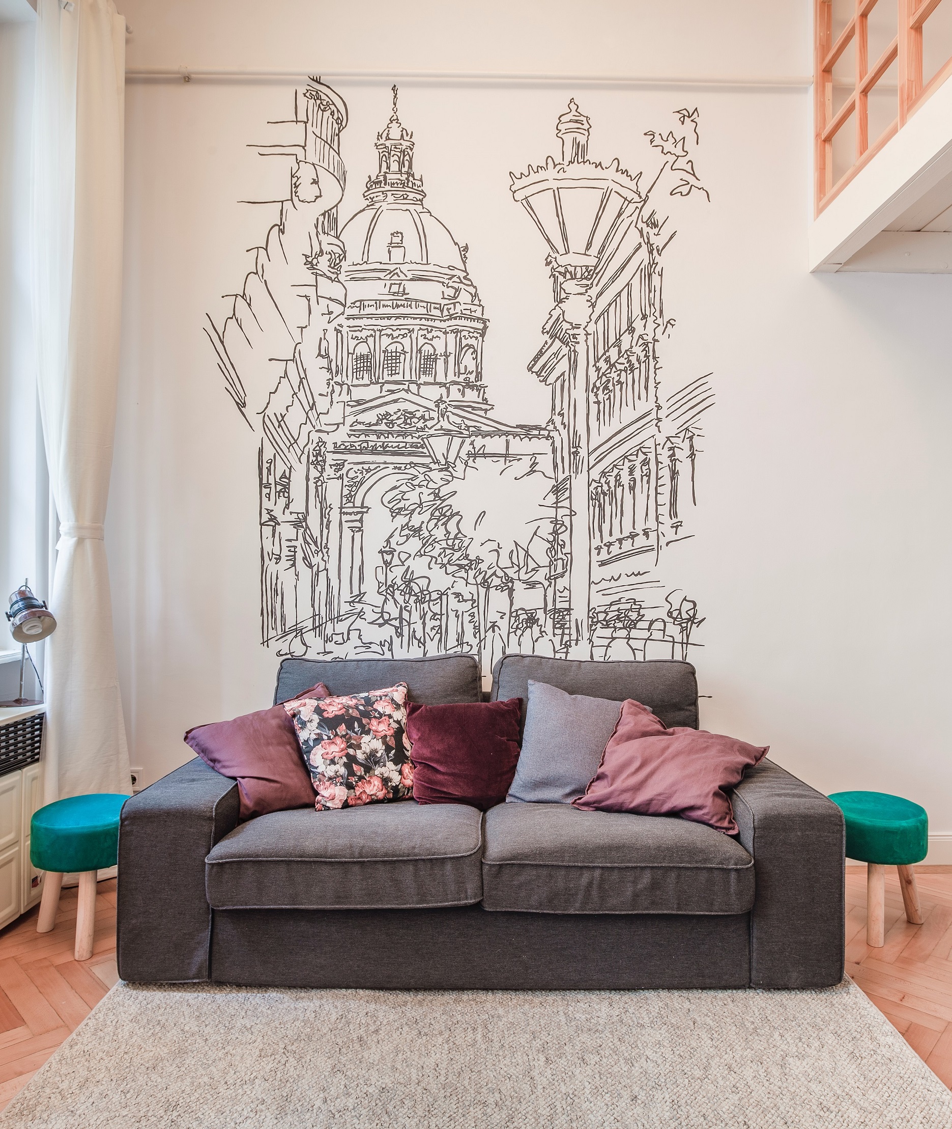 In this 33 m2 floor space we designed spacious, functional and beautiful apartment. This flat will be rented out for tourists and foreigners who come to Budapest for short period of time and we want them to feel special in this unforgettable place, what they would get to love and never forget. We connected modernity with traditional Hungarian style, that is why we used red, green and white colors. What is more, we painted St Stephen Basilica’s graphics on the wall in the living room. This is one of the most popular and beautiful touristic attractions in Budapest. It was our “100% of interior design” type of project. We have prepared all necessary plans and design, moreover we did most of renovation works by our own hands as well!