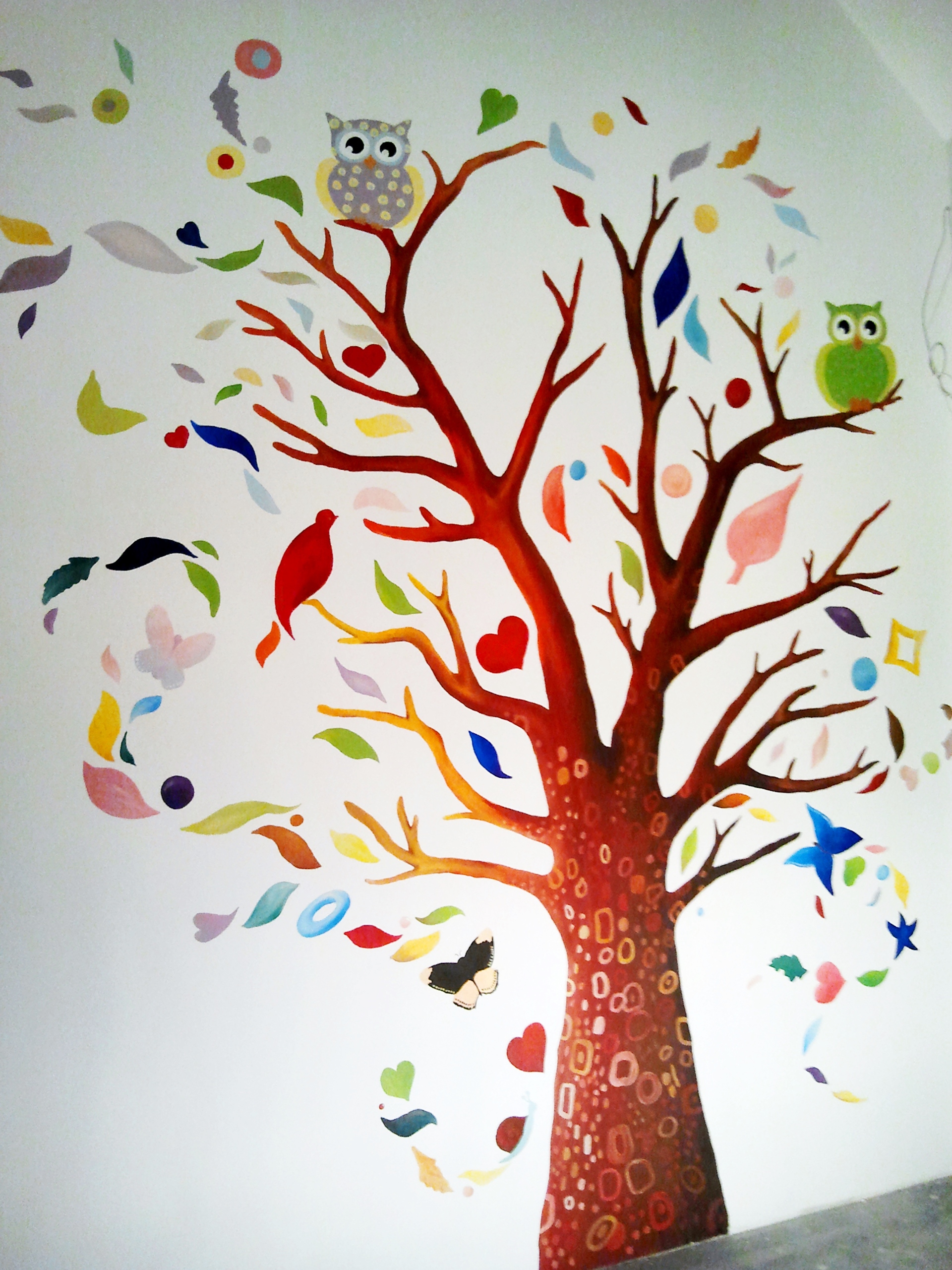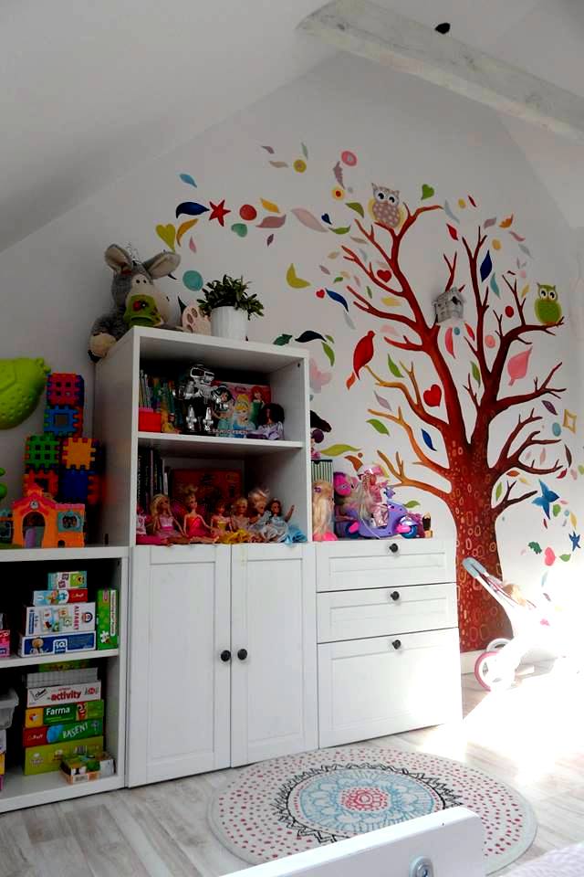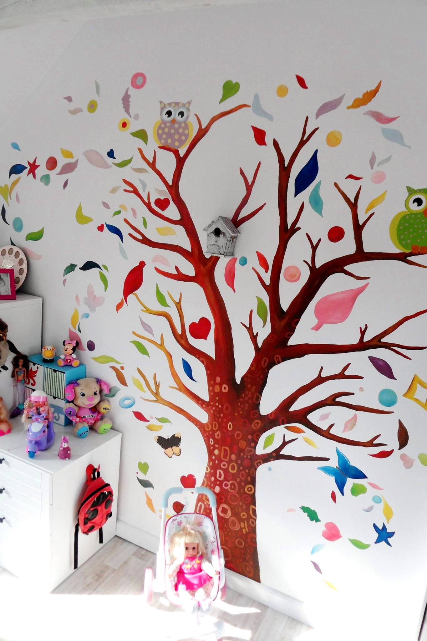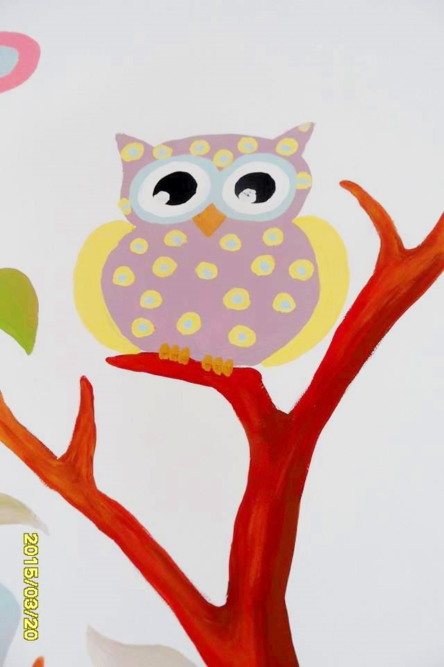 Our Artist, Marta Borsodi, painted this beautiful tree on the wall for little Ola. The tree is full of colors, figures, leaves. On the second wall Marta painted one branch with three owls.The painting took around 36 working hours.